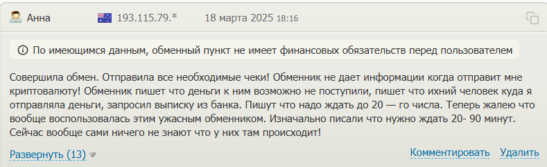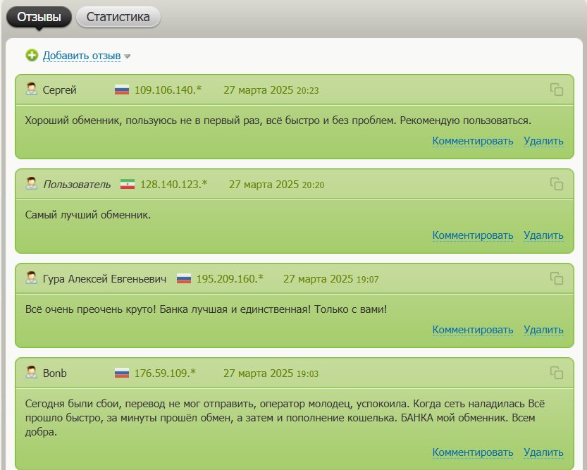 В основном озывы о площадке Банка обменник позитивные. Люди отмечают, что транзакции прошли без проблем и средства были получены.