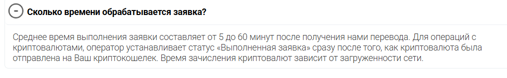 В среднем заявка здесь якобы обрабатывается от 5 до 60 минут, однако обратим внимание, что никаких гарантий в этом плане создатели не дают, т.к. в конце добавляют о том, что время зачисления зависит от “загруженности сети” – этим вполне могут манипулировать.