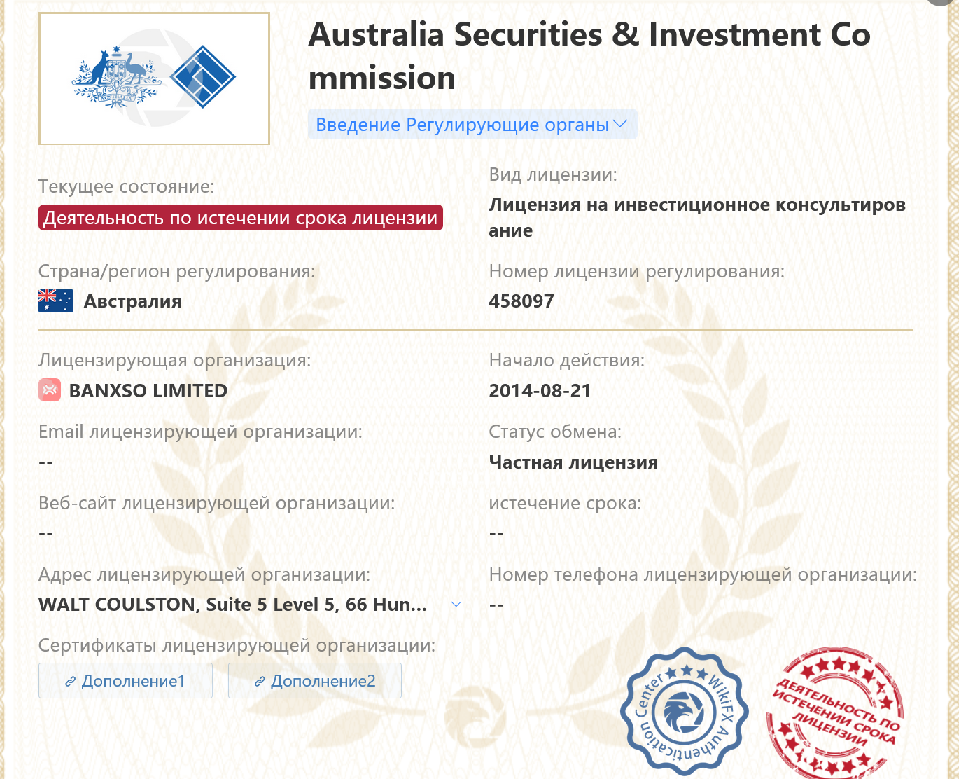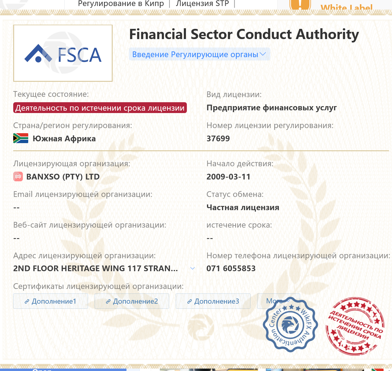 Компания из Южной Африки имеет 3 лицензии на ведение финансовой деятельности. В 2021 году было получено разрешение в Австралии, но в 2025 году срок разрешения истек, поэтому компания ведет дела по истечению срока лицензии, о чем сделаны официальные записи.