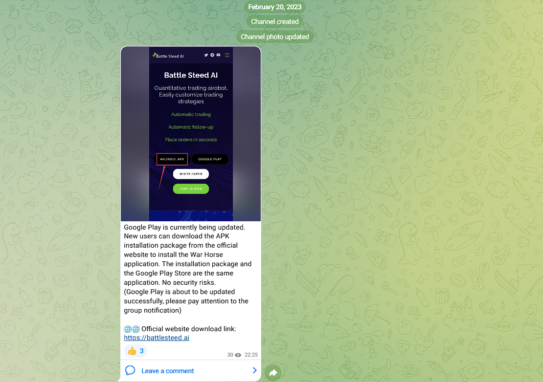 В телеграм канале battle steed ai official они делились инструкцией по установке приложения для заработка с сайта, объясняя отсутствие на play market техническим обновлением.
