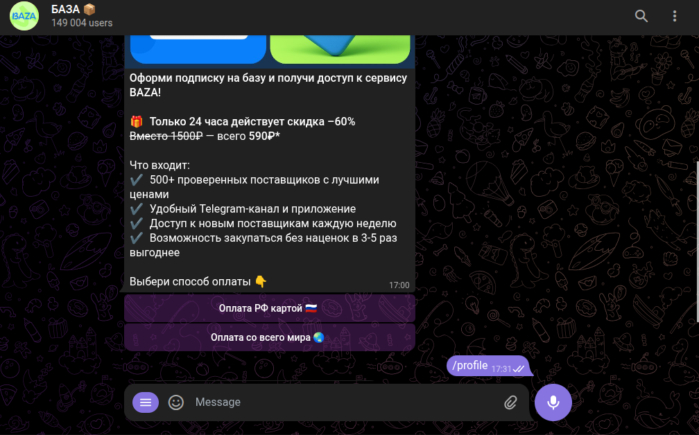Оплатить подписку можно российской банковской картой или международным платежным средством. По комиссиям и срокам обновления подписки информации нет никакой. Однако, известно, что никто ничего не получает. Пользователь оплачивает вакуум, так как никакой базы данных поставщиков у биржи в телеге Baza New нет. Вернуть деньги тоже не получится, потому что техническая поддержка сразу заблокирует доверчивого покупателя.