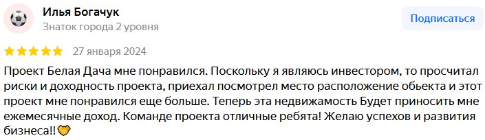 Проект Белая Дача Инвестиции в недвижимость уже частично готов и принимает гостей, о нем уже появились отзывы. Часть клиентов довольна проектом и заявляет, что он является перспективным.