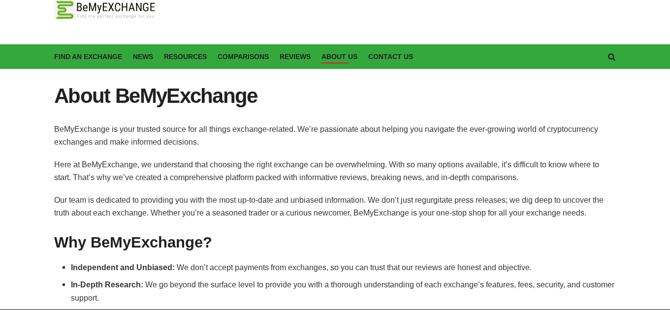 На сайте BeMyExchange com в разделе About разработчики рассказали, что «Би Май Ексчендж» — надежный источник информации для каждого пользователя. Чтобы использовать контент, не нужные специфичные знания или навыки, так как весь материал изложен максимально доступным языком. Кроме этого, авторы проекта заявили, что они детально изучают каждую биржу и предоставляют максимально объективный материал, чтобы пользователи могли самостоятельно принять решение насчет проектов.