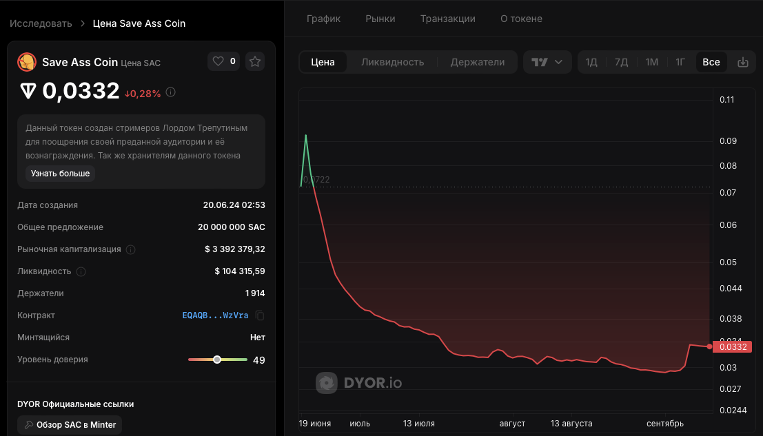 Токен SaveAssCoin по-прежнему можно купить. Он представлен только на одной криптовалютной бирже – DeDust. А на нее, как известно, пускают практически все, в том числе и откровенные скам-монеты.