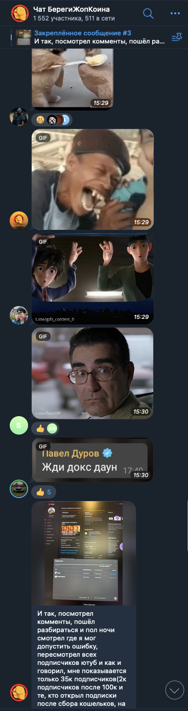 Также в рамках проекта «БерегиЖопКойн» существовал и телеграмм-чат. В нем, в свою очередь, состояло чуть больше 1,5 тысяч участников. Но и в этом аккаунте какая-либо активность прекратилась в конце июня. А админ отключил возможность писать в чат новые сообщения.