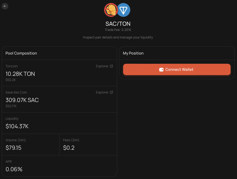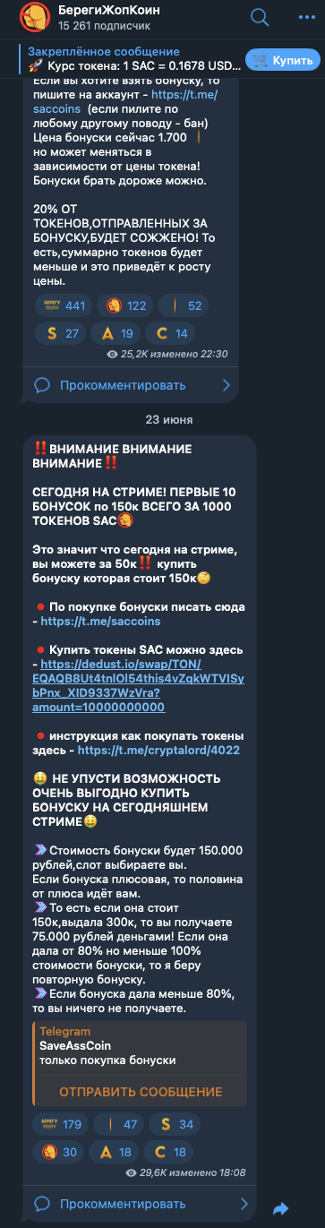 Пока еще SAC можно купить на DeDust. Однако мы настоятельно не рекомендуем тратить деньги на данный токен. Это гарантировано приведет к потере всех вложенных в соответствующий «актив» средств.