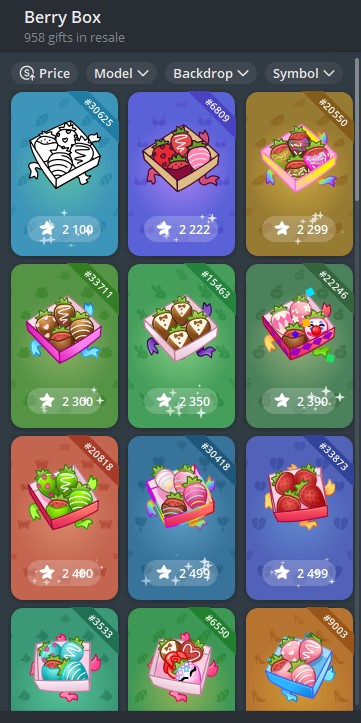 Включает в себя набор Berry Box в Telegram тысячи разных изображений подарочной коробки с ягодами в шоколаде. Отличаются они по цветам, самой начинке, фону, стикерам на нем и так далее. Чем реже параметры в получившейся комбинации, тем реже считается НФТ, за него можно просить больше тонов на маркетплейсе.