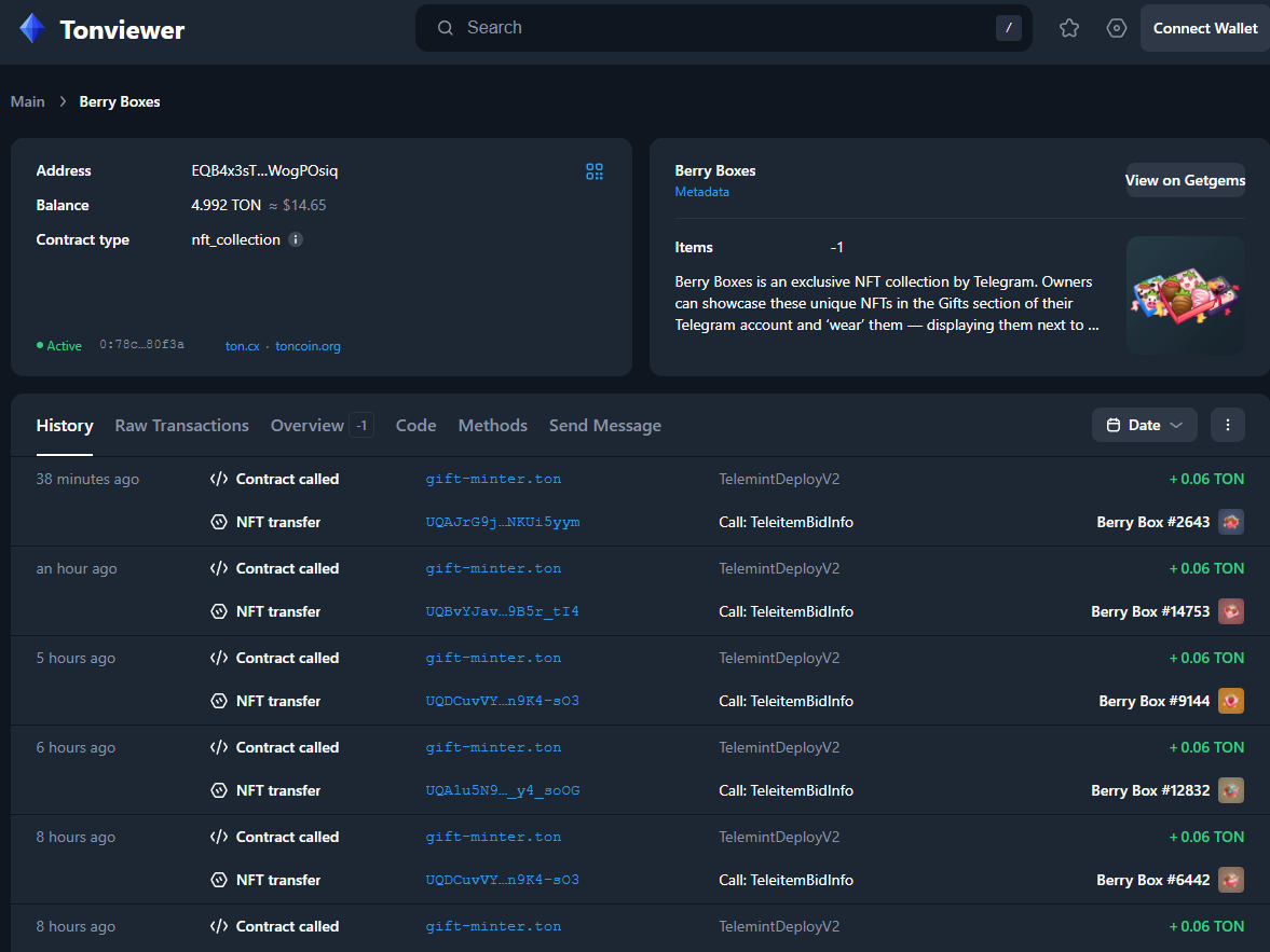 Также при оценке НФТ Берри Бокс рекомендуется посетить крипто сканер Tonviewer. Здесь содержатся важные технические данные по коллекции и ее связи с блокчейном: транзакции, распределение, исходный код и прочее.