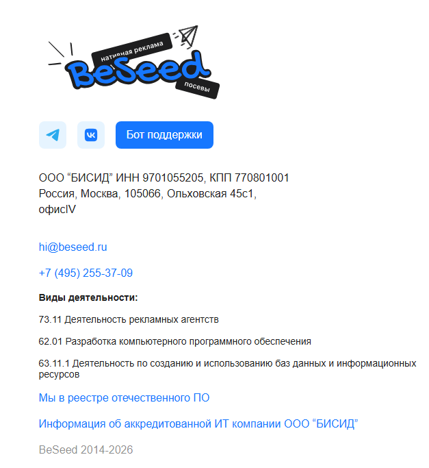 Если копнуть глубже, фирма перестает быть сомнительной компанией-однодневкой. Сайт Beseed Ru работает с 2014 года, что нехарактерно для скам-проектов. Площадкой управляет ООО «Бисид», на портале указаны номер телефона конторы, адрес офиса и электронная почта hi @ beseed ru.