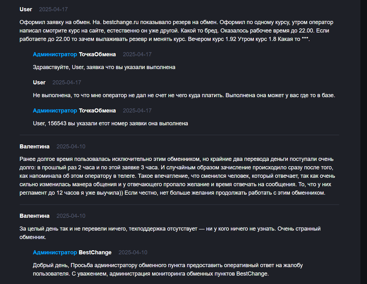 Что касается негативных комментариев о сайте tochka obmena, отзывы содержат жалобы на отмену заявки после оплаты без возврата средств. Пользователи пишут, что представители сервиса намеренно затягивают процесс, чтобы обмен прошел по более выгодному для них курсу. Есть жалобы на грубое обращение, подкрепленные со стороны клиентов скриншотами.