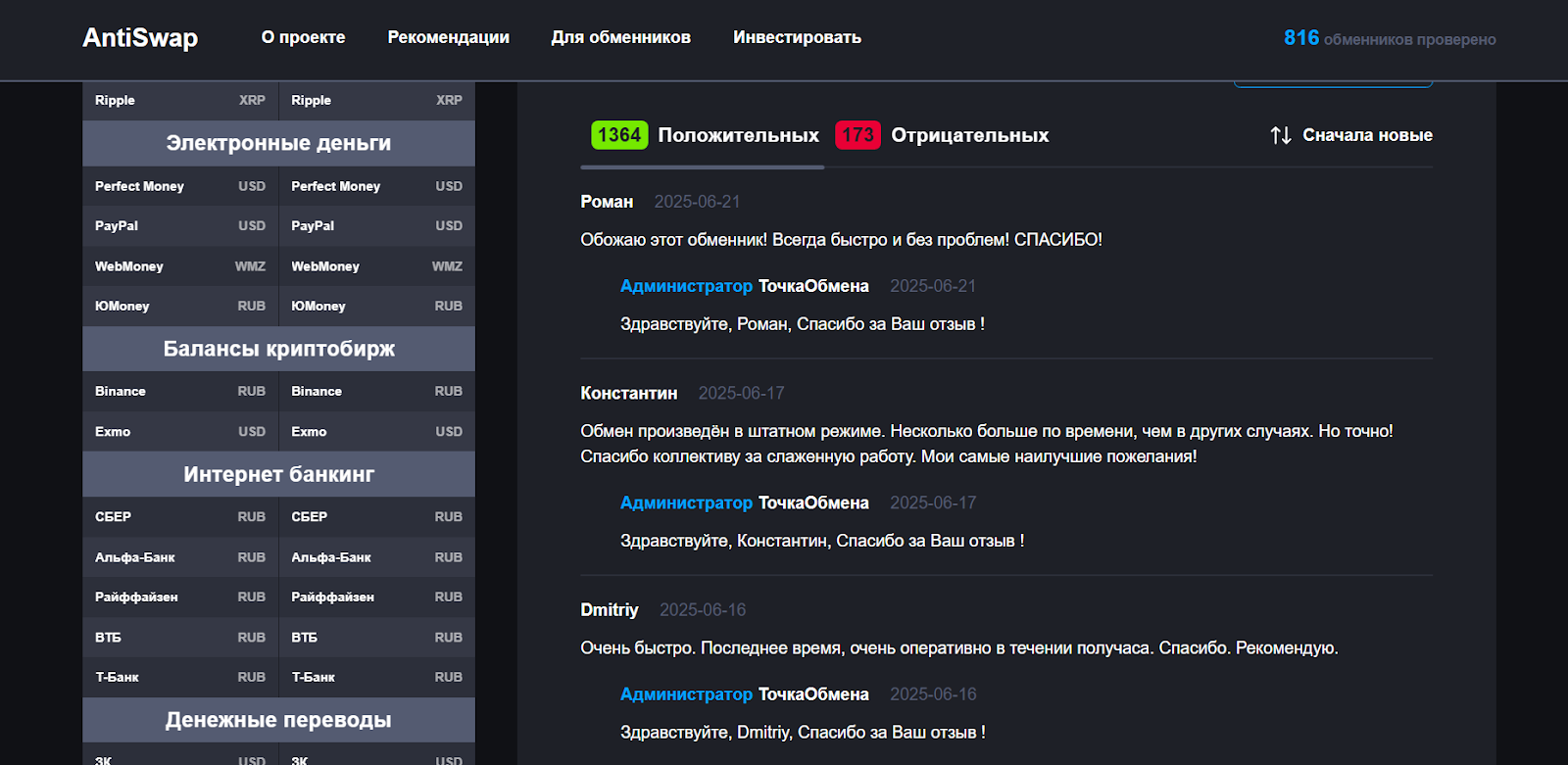 Выложенные на официальном сайте «Точка обмена» отзывы в основном положительные. Клиенты говорят о длительном сотрудничестве, хвалят обменник за то, что деньги приходят быстро. На сайте проверки обменников AntiSwap репутация у сервиса тоже в основном положительная.
