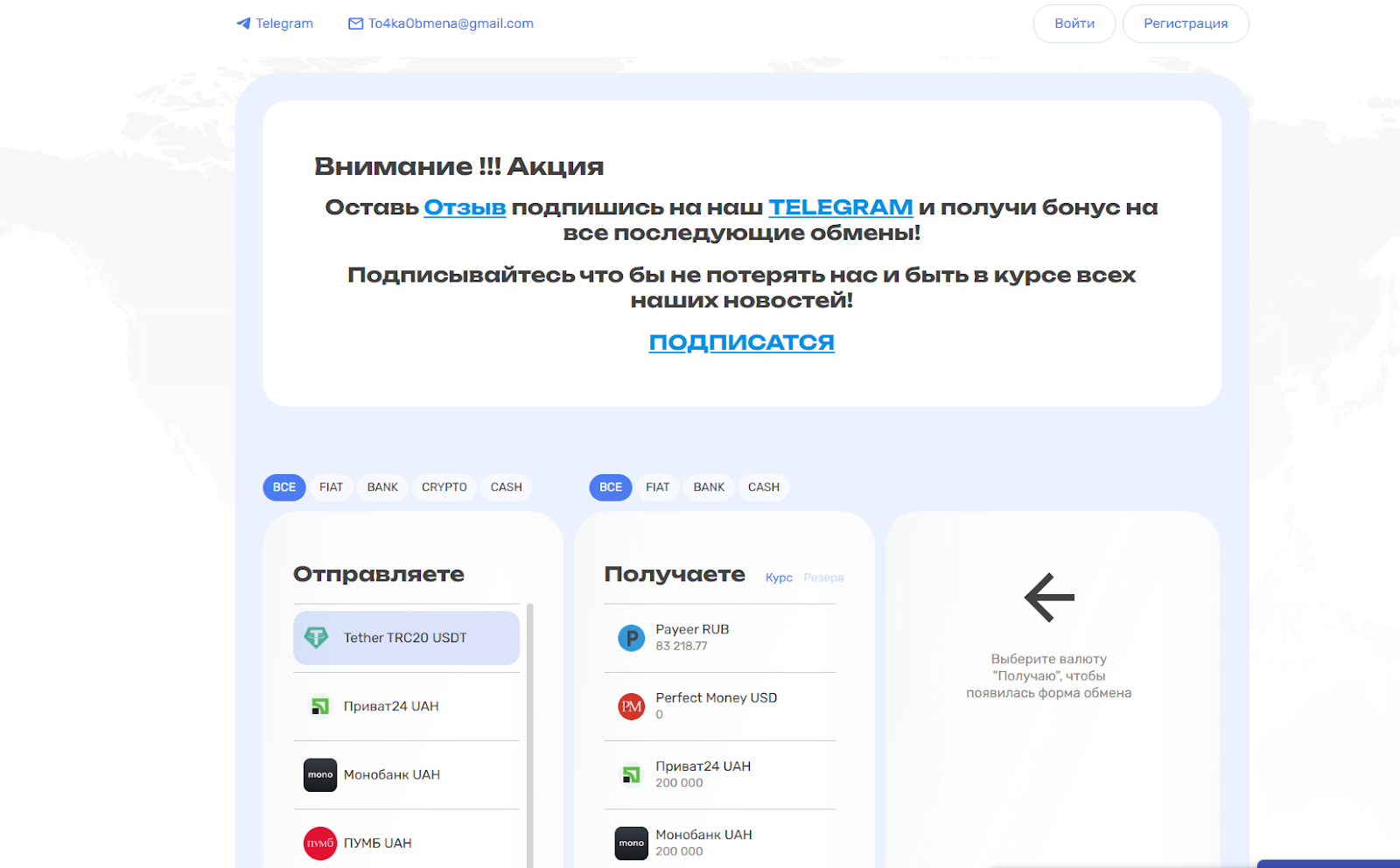 Онлайн обмен доступен в круглосуточном режиме, жалобы можно направлять на электронную почту To4kaObmena gmail com или в Telegram пользователю Tochkaobmena com. Администрация размещает апдейты о работе обменника в официальном Телеграм-канале Tochkaobmena news.