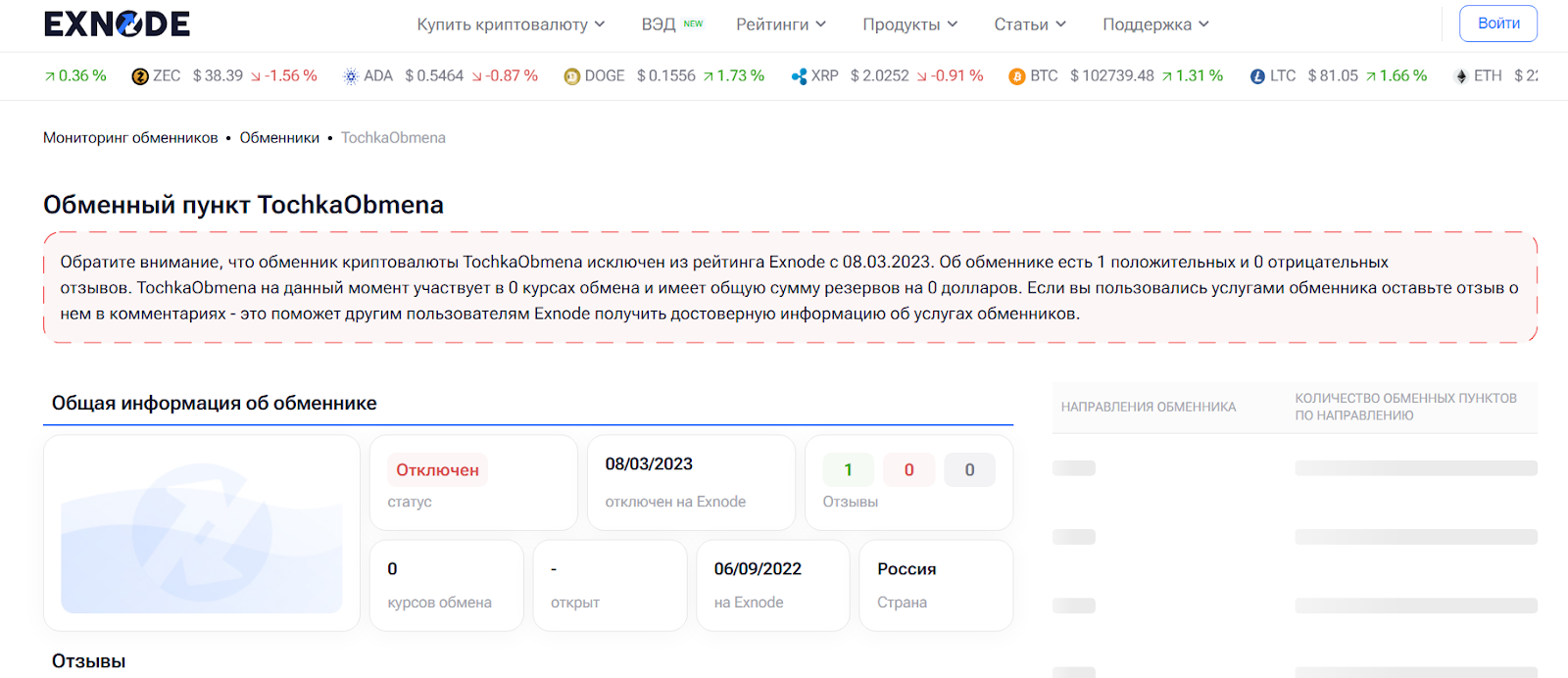 Если вы работали с обменным пунктом Tochkaobmena и у вас есть свое мнение, оставьте отзыв на нашем сайте.
