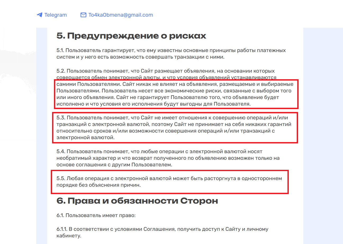 Стоит отметить, что сервис снимает с себя все обязательства по отношению к клиенту и не дает гарантий относительно результата, т. е. выполнения своих обязательств по обмену валют. Также есть пункт о том, что обменник может отменить транзакцию без объяснения причины.