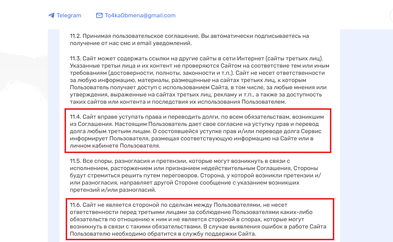 Важно также отметить, что представители сервиса Best Tochkaobmena оставляют за собой право передать третьим лицам пользовательскую информацию, а также долги и незавершенные транзакции. При этом они отказываются от ответственности за передачу.