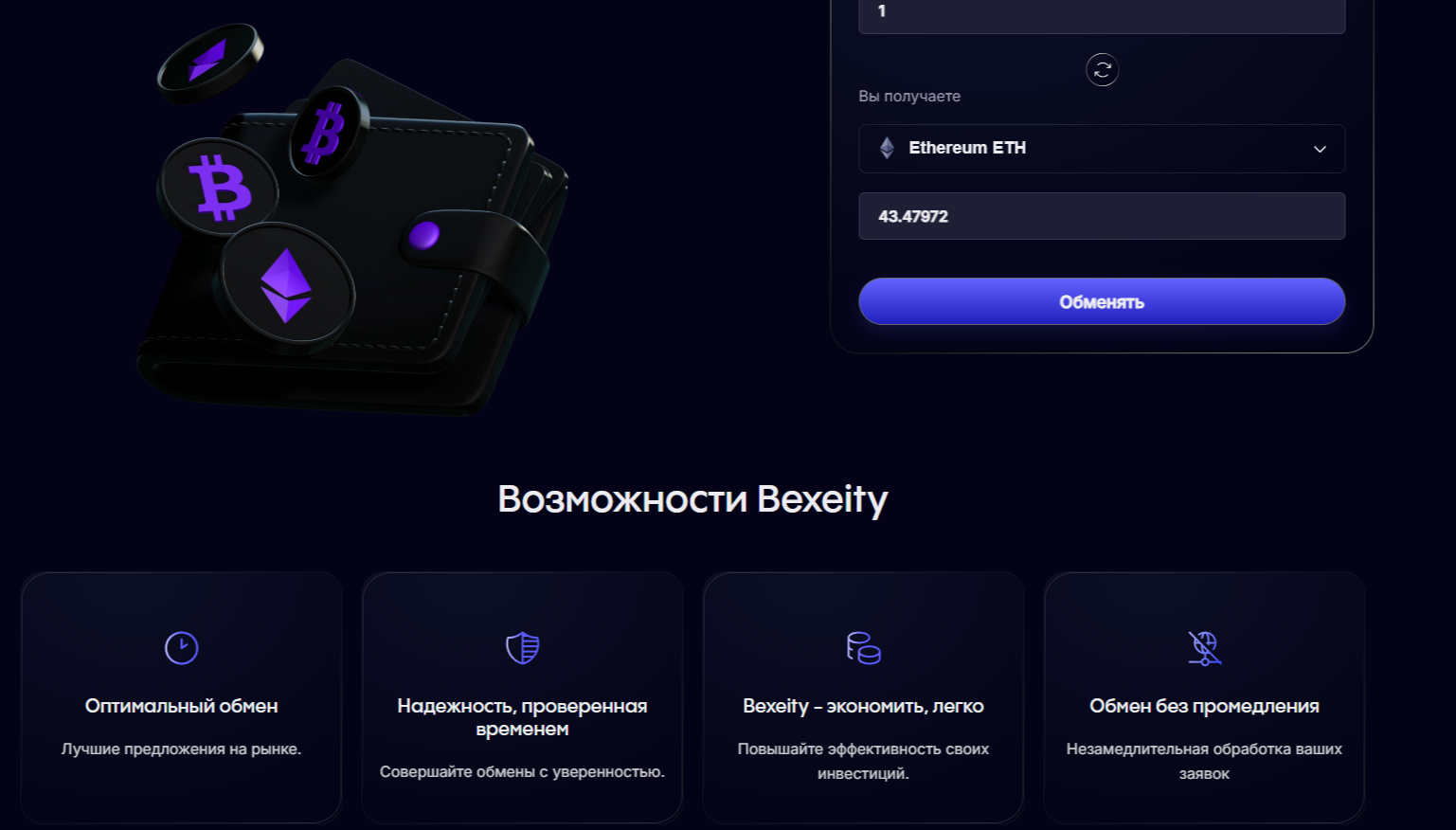 Обменник Bexeity – молодой сервис по обмену цифровых активов. Возможности обменного пункта безграничны, так считают его создатели. Данный сервис предлагает жителям РФ и других государств выгодный обмен криптовалюты, экономию, анонимность и безопасность. Возможно ли сотрудничество с упомянутой платформой – читайте в нашей новой статье.