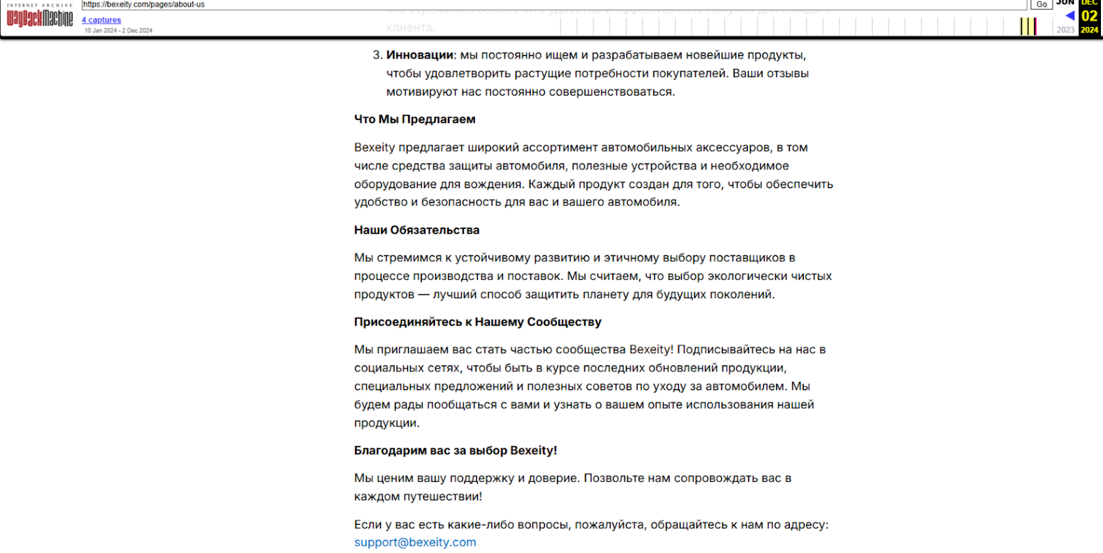 В процессе проверки нами установлено, доменное имя bexeity com было зарегистрировано 5 октября 2023 года. Однако это совсем не значит, что криптообменнику более года. Еще в конце 2024 года домен принадлежал магазину автомобильных аксессуаров. Фейковым криптообменником сайт стал 24 июня 2025 года.