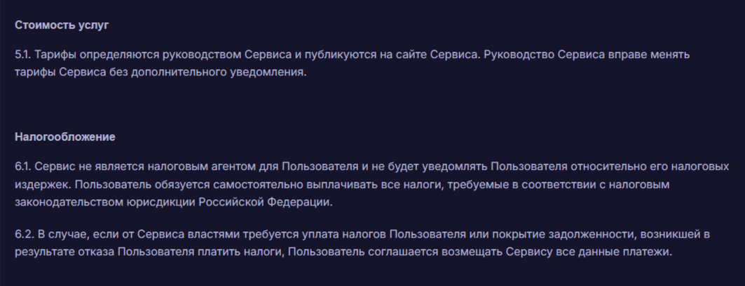 Упомянутое выше соглашение предупреждает потенциальных клиентов о том, что указанный процент может быть неокончательным. На основании пункта 5.1. администрация сервиса в любой момент может изменить тарифы без предупреждения клиентов. Пункт 6.2 говорит о том, что к основной комиссии могут быть приплюсованы деньги, якобы направленные на покрытие задолженности перед государством.