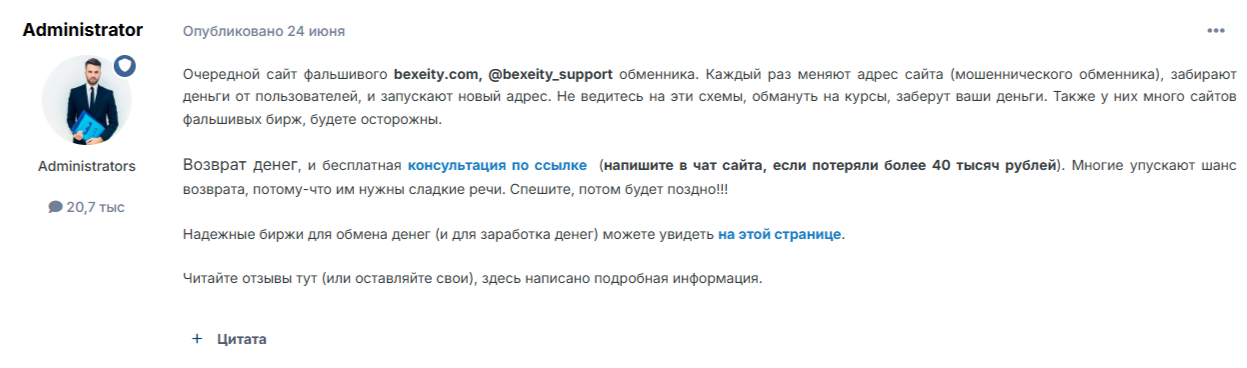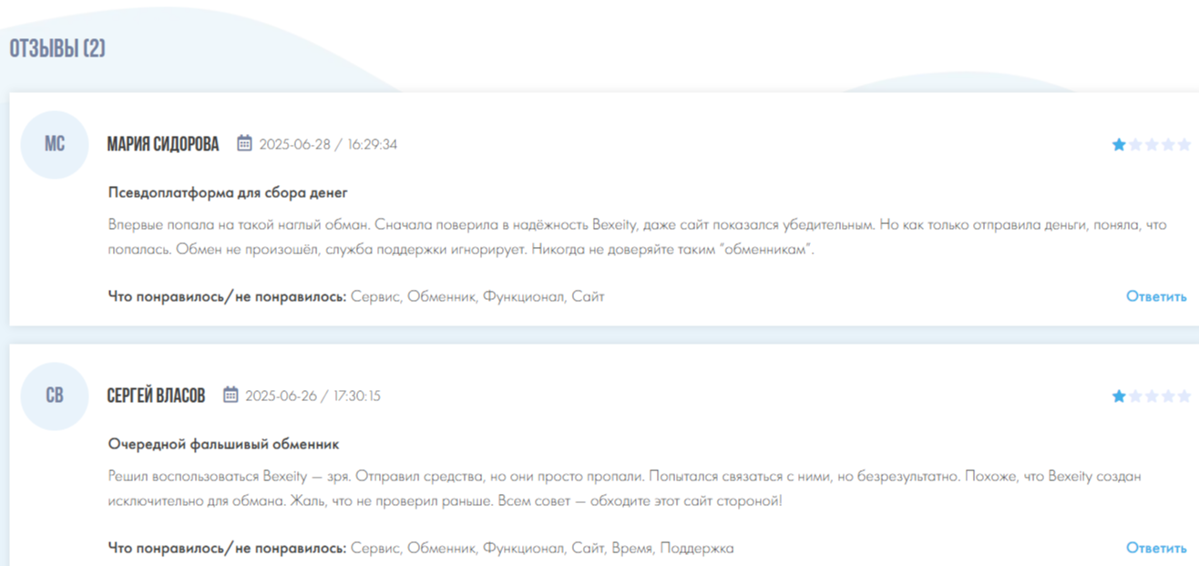 Мировая паутина предоставила нам лишь отзывы о сайте bexeity com с большим знаком минус. В них платформу для обмена обычные люди обвиняют в присвоении средств. Эксперты же называют ее мошеннической и не рекомендуют сотрудничать с фейковым сервисом.
