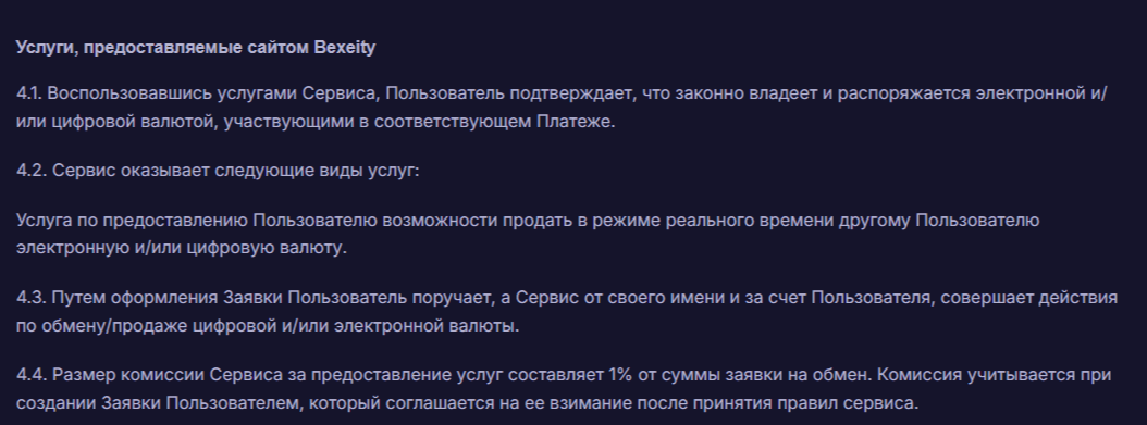 Тарифы обменного пункта «Бексеити» идентичны ценнику многих конкурентов. Комиссионный сбор обменника составляет 1% от платежа. О величине комиссии, услугах, общих положениях можно узнать в разделе сайта «Пользовательское соглашение».