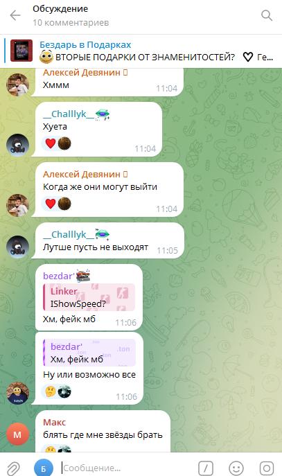 «Бездарь в Подарках» обещает легкий заработок и регулярные бесплатные подарки за активность в телеграмм. Мы проверили этот проект, проанализировали контент, информацию об админе и отзывы. На основании собранных данных мы пришли к выводам: