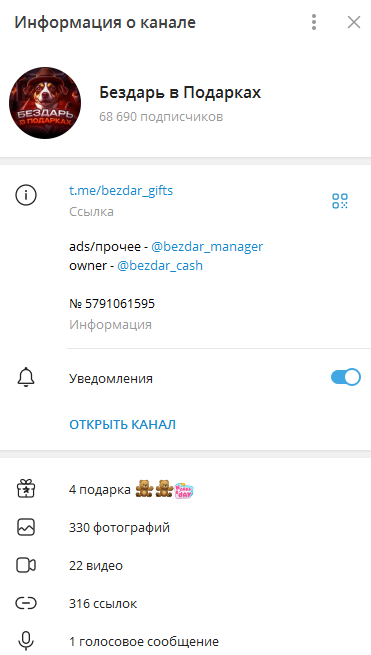 Канал «Бездарь в Подарках» появился в феврале 2025 года. Он собрал 68,6 тысяч подписчиков. Просматривает посты примерно пятая часть из них. Автор не закрывал комментарии и реакции. Комментариев мало – обычно не больше десяти. Указан контакт менеджера: Bezdar manager.