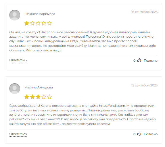 Нам удалось найти комментарии, связанные с этим сайтом. В отзывах о Bhtjk com утверждается, что проект занимается разводом и приводит к убыткам клиентов.