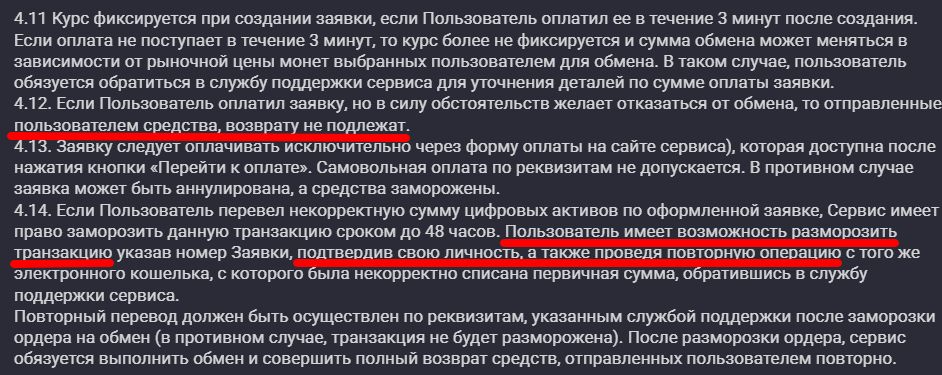 Это откровенно мошенническое условие, противоречащее логике. Во-первых, что именно обменник подразумевает под «неправильной суммой», а во-вторых, непонятно, для чего нужно отправлять платеж на ту же сумму, чтобы разблокировать обмен. Согласно п. 4.12. возврат не производится в принципе. Политику AML компания не соблюдает, следовательно не вправе блокировать обмены.