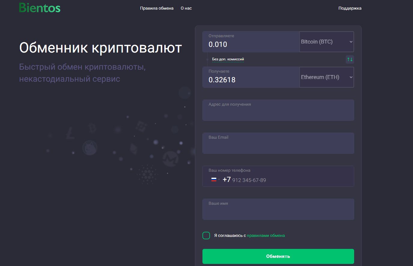 Для обмена на Bientos com достаточно выбрать криптовалюту, ввести адрес кошелька, телефона, почты и имени.