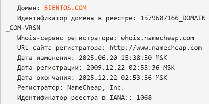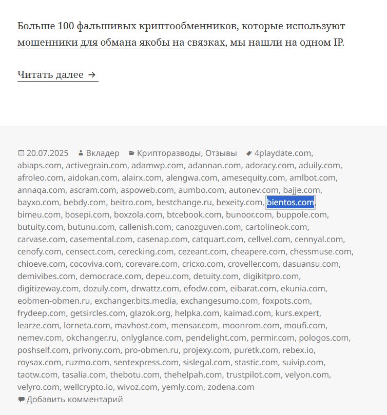 Если домен приобретался в мошеннических целях, то по небрежности владельцы могли забыть обновить год. Помимо прочего, Bientos входит в список более 100 подозрительных обменников, обнаруженных на одном IP-адресе.