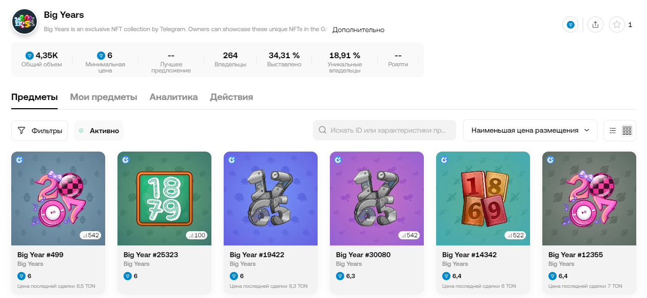 На площадках, специализирующихся на продаже Nft Telegram, подарок Big year, судя по демонстрируемой статистике, особым спросом не пользуется.За время нахождения на витрине маркетплейса, то есть за целый месяц, НФТ ТГ Big year купили только 3 раза. Народ смотрит на гифты, расположенные на прилавке, но проходит мимо.