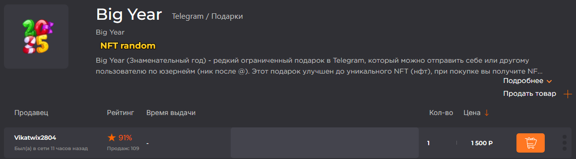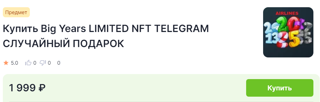 В сети на платформах по продаже NFT предлагают купить ТГ подарок Big Year. На сколько безопасно вкладываться в этот товар, имеет ли он ценность на рынке финансовых активов, мы постараемся выяснить в этом обзоре.