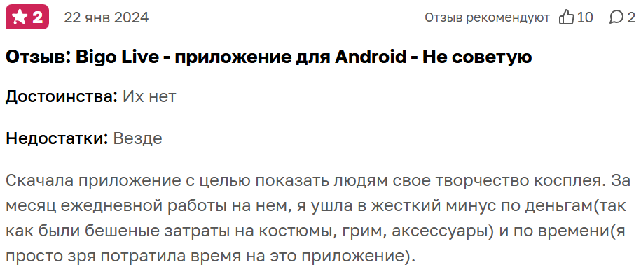 Единственным минусом является неудобный вывод денег для жителей СНГ. Потерять вложенные деньги из-за Bigo не получится, но не факт, что контент конкретного стримера окажется интересен публике и будет собирать донаты перед тем, как пытаться зарабатывать в Биголайф, стоит взвесить риски.
