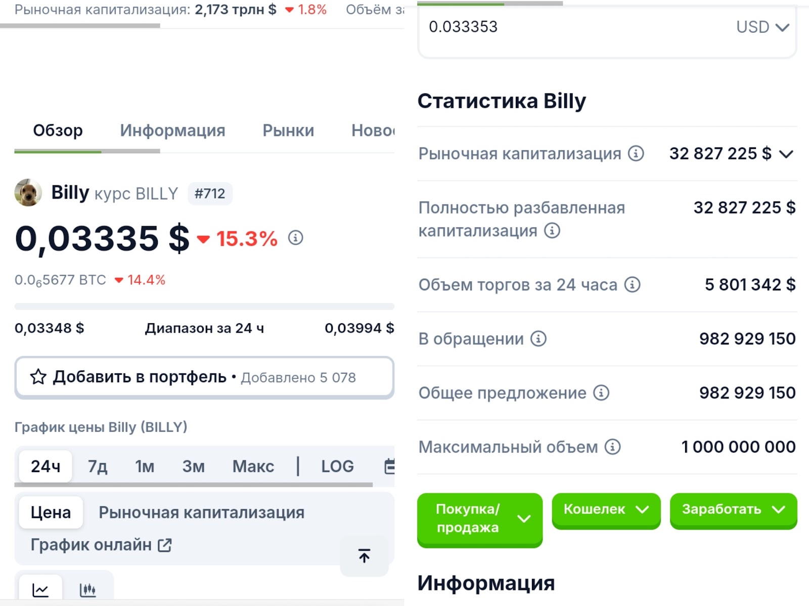 Исходя из информации о мемкойне Билли с CoinGecko: