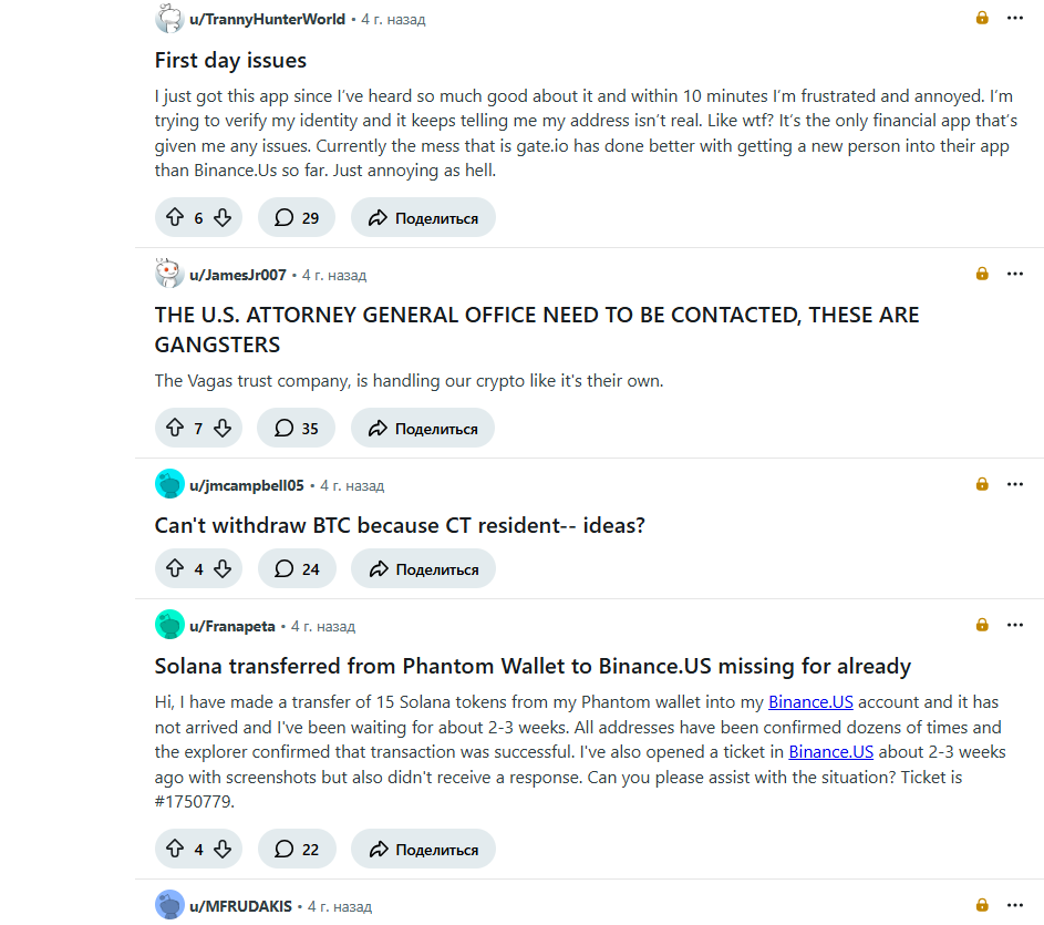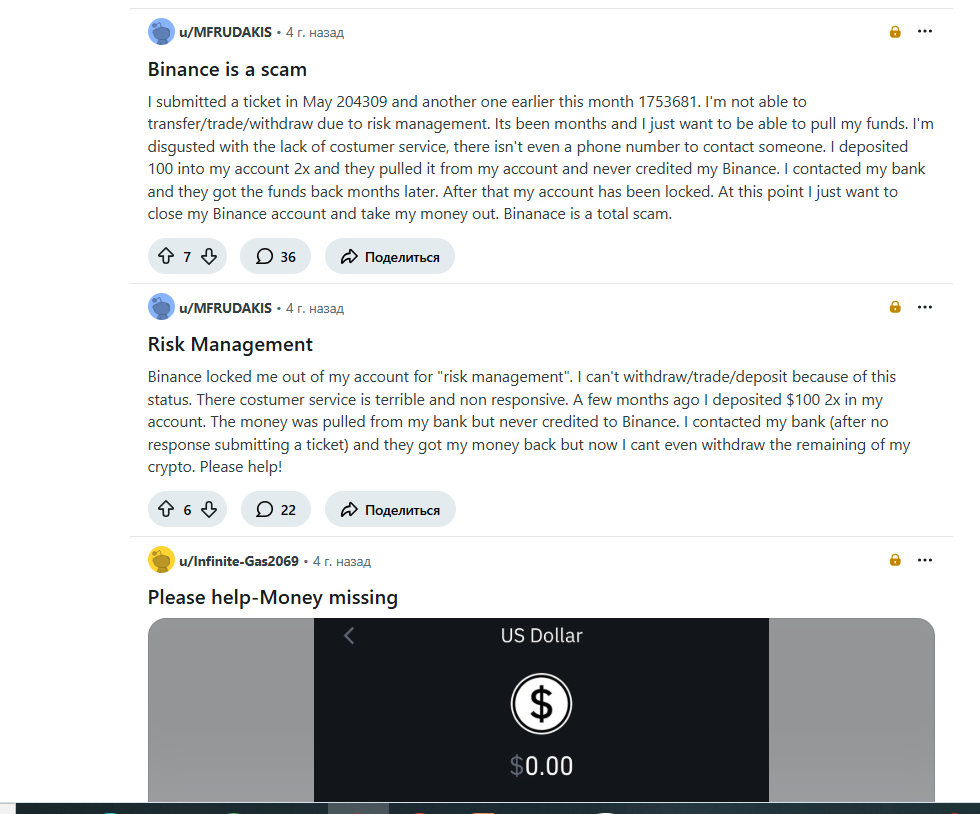 Существует отдельный сабреддит r/BinanceUSComplaints, где за несколько лет накопилось много кейсов. Там пользователи жалуются на очень медленную или отсутствующую поддержку, зависающие тикеты, проблемы с 2FA и невозможностью войти в аккаунт, “застрявшие” выводы и блокировки аккаунтов.