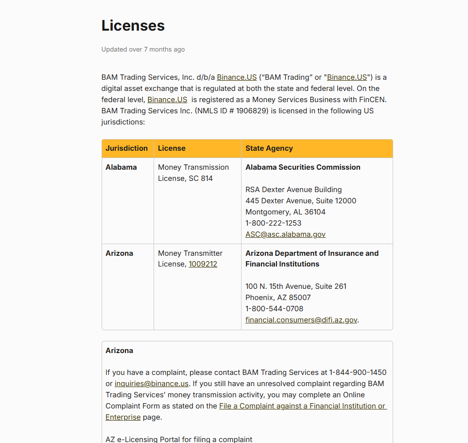Биржа запущена в сентябре 2019 г., юридически привязана к США, зарегистрирована как Money Services Business в FinCEN, имеет NMLS-ID 1906829 и целый набор лицензий на перевод денег в разных штатах — это подтверждается в официальном разделе Licenses на сайте BinanceUS и в материалах о регулировании крипто-бирж в США.