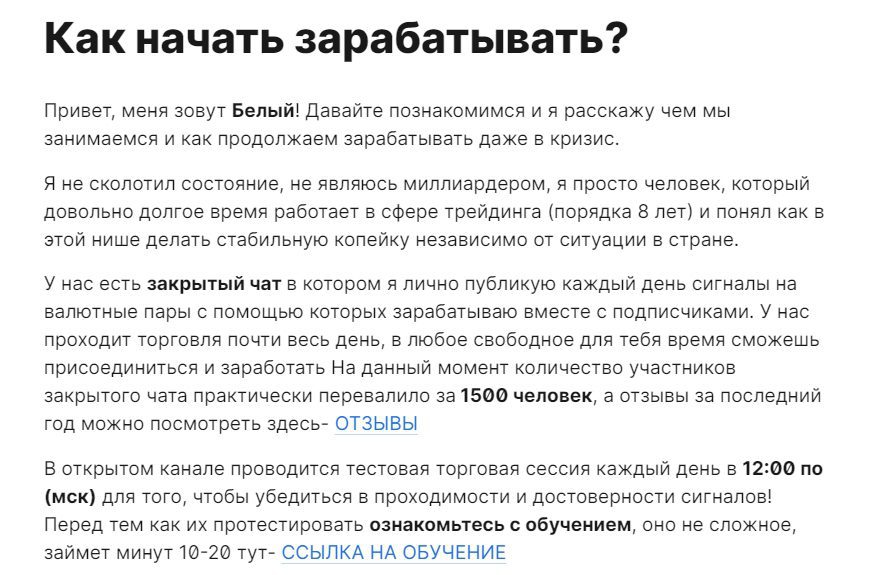 Подписчики канала Бинарные ограбления не выкладывают в открытый доступ результаты и не публикуют каких-либо фактов в пользу эффективности мошеннической схемы. Кроме этого, со стороны Белого Нигера не предусмотрено документальное оформление отношений с пользователями, например, в форме соглашения или договора.