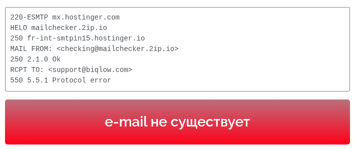 Где взять промокод, непонятно. Нет ни ссылки, ни инструкции, ни контакта, по которому его можно запросить. Еще один подозрительный момент — при проверке почты саппорта Biqlow через SMTP-валидатор выяснилось, что адрес support @ biqlow com не существует.