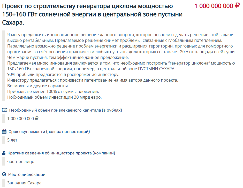 Человек собирает 30 миллиардов евро, которые никогда не получит на такой площадке. Потом он уедет в Сахару, и будет заниматься проектом минимум 5 лет. Выглядит, как отличная попытка набрать денег и уехать за границу, а потом отчитаться о том, что ничего не получилось.