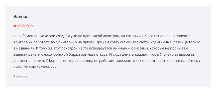 В единственном найденном ревью некий Валера пишет, что «БитСейф» — это лохотрон. Он утверждает, что существует много сайтов, которые похожи на этот, но имеют различные названия. Он убеждает, что все эти ресурсы принадлежат мошенникам.