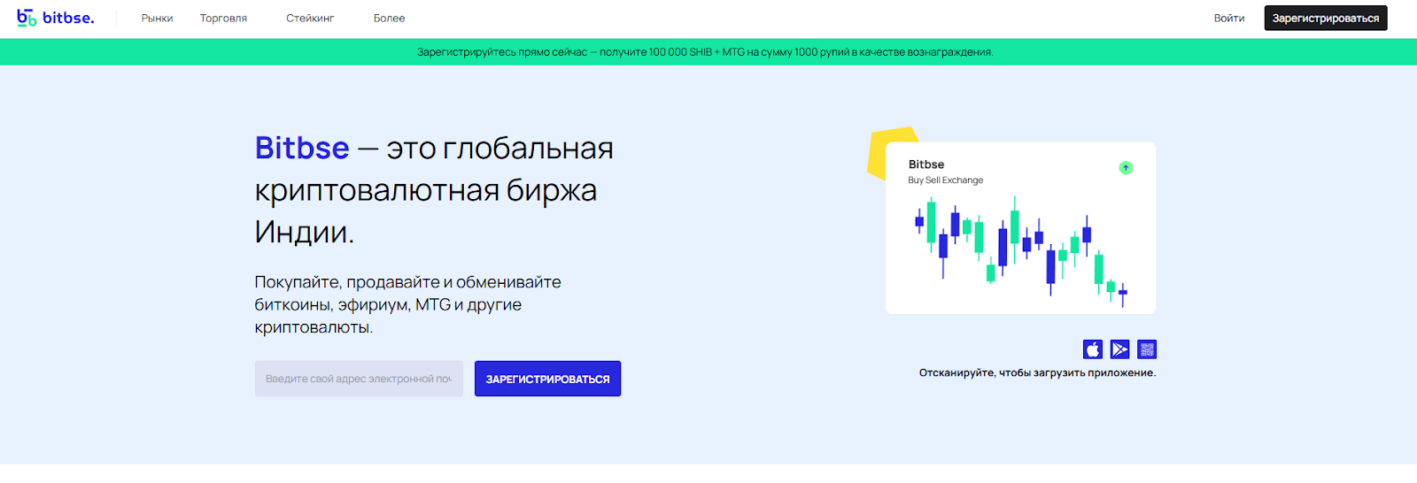 Дизайн Bitbse в светлых тонах. Навигация простая и понятная. На главной есть калькулятор для расчета стоимости активов в рупиях. Интерфейс выглядит современно.