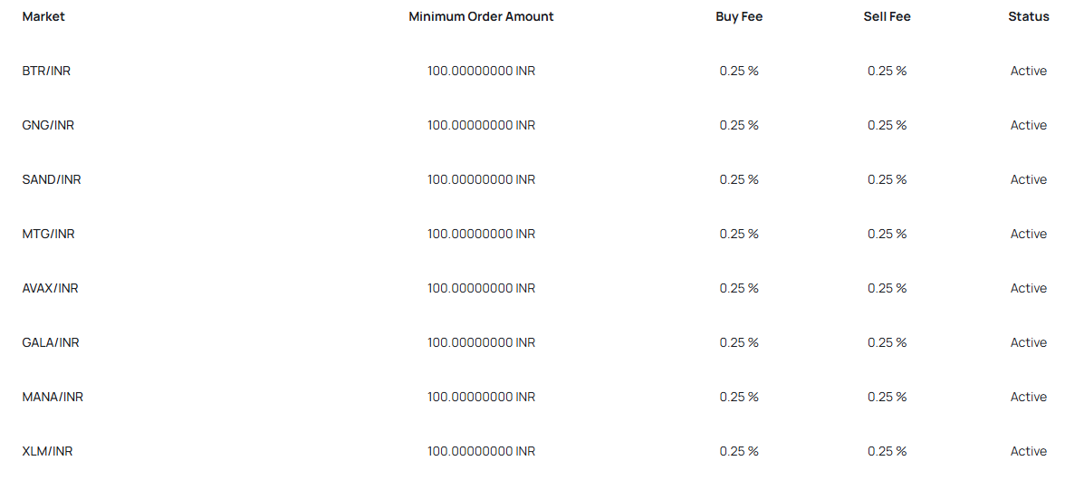 Торговля идет двумя способами. Через рыночный ордербук комиссия 0,25%. Мгновенный обмен (OTC) без комиссии. Правда, лимиты на OTC от 100 до 500 000 рупий. Максимальная сумма ограничена. Маржинальной торговли нет. Только спотовая торговля и стейкинг. Торговые пары – исключительно к индийской рупии. Пар между криптовалютами не предусмотрено.