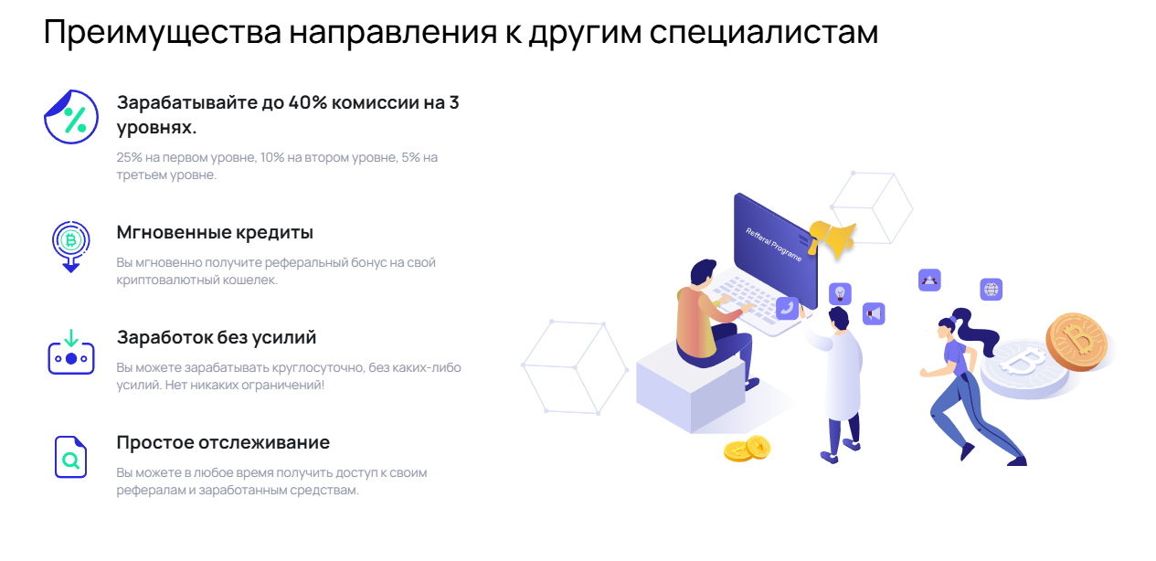 Реферальная программа предлагает бонусы при регистрации. Новички получают 100 000 SHIB плюс MTG на 1000 рупий. За приглашенного друга начисляют MTG на 100 рупий. Структура трехуровневая: 25% на первом уровне, 10% на втором, 5% на третьем.