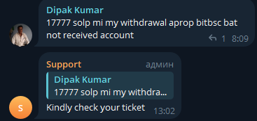 Телеграм-чат Bitbse Exchange Support (bitbse exchange) насчитывает 7700 участников. Активность низкая. Пользователи иногда жалуются на проблемы с выводом. Есть также задержки с выводом. Клиенты создают тикеты из-за задержек с выводом MTG и рупий. Ответы шаблонные: «проверьте ваш тикет». Конкретики ноль. Сроки решения не называют.