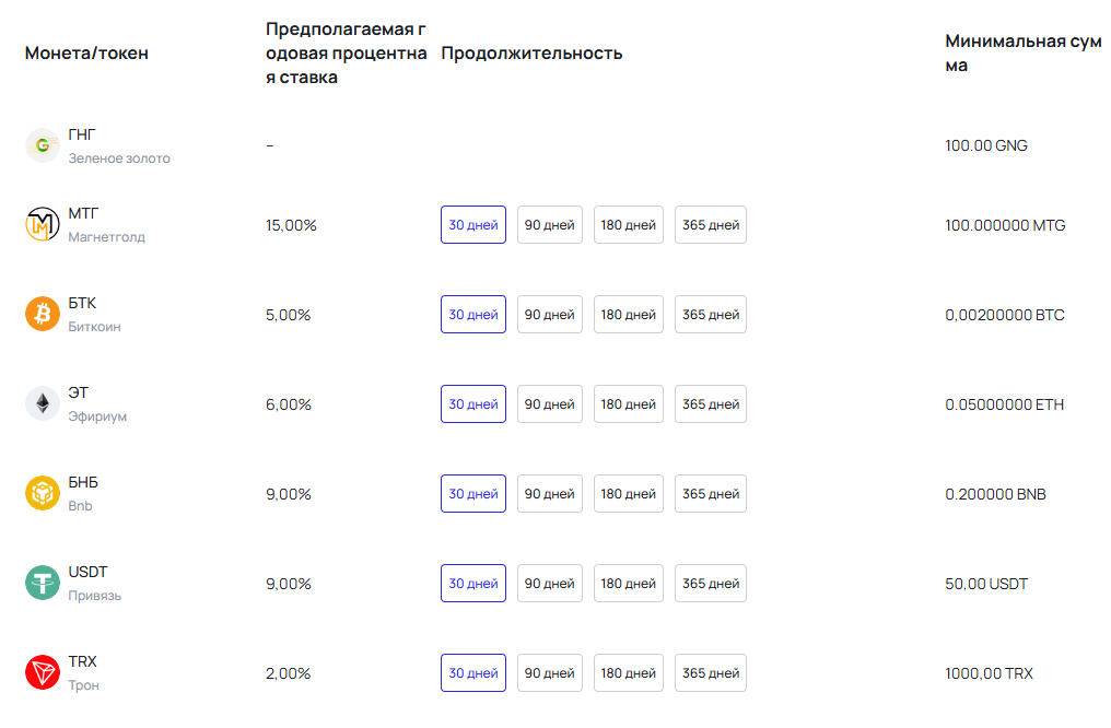 В разделе «Стейкинг» можно заработать на блокировке монет. Сроки разные. От 30 дней до 1 года. Ставки до 15% годовых зависят от актива. Например, MTG дает 15%, а TRX только 2%.
