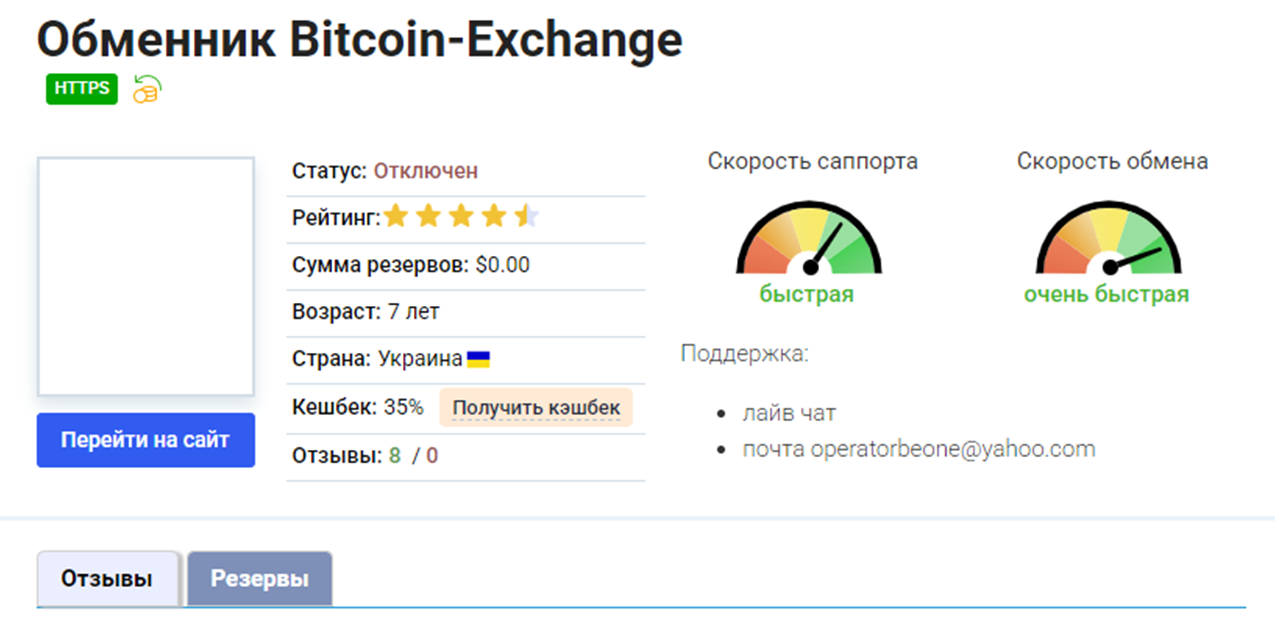 По данным мониторинга Bitcoin exchange создан разработчиками из Украины. Но информации о резервах и точном месте дислокации не предоставлено. В статусе обменника сказано, что он отключен. Но когда именно была прекращена работа обменника – неизвестно. Точных данных об этом нет.