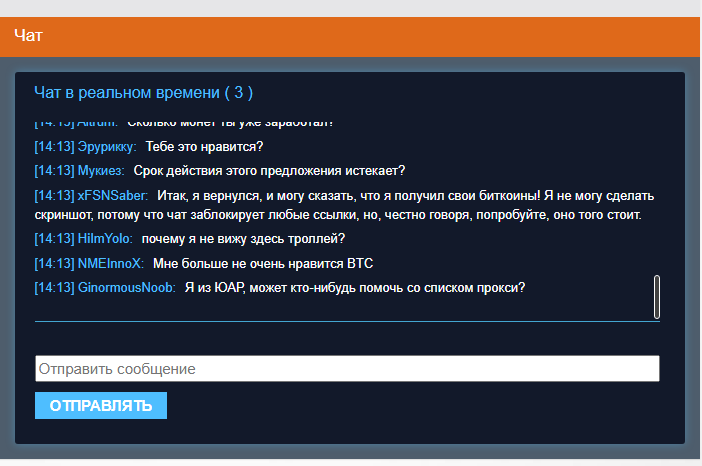 Для убедительности на сайте сделали чат с «живым» общением. На деле диалоги генерировал скрипт и фразы время от времени повторялись. После ввода кошелька через 35 минут появлялось сообщение о том, что биткоины готовы, но нужна комиссия в размере 0,00294 BTC. Жертва переводила деньги и ничего затем не происходило. Пожаловаться нельзя — в поддержке тоже отвечал бот, который не мог решить возникшие сложности.