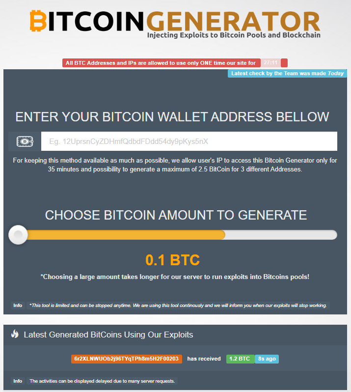 Из архивных данных известно, что платформа предлагала заработать 2,5 BTC за 35 минут, что уже звучит нереально. Для работы нужно было передать адрес своего биткоин-кошелька. Единственное ограничение — с одного IP можно использовать только три кошелька. За счет чего происходила генерация биткоинов — никто не объяснял.