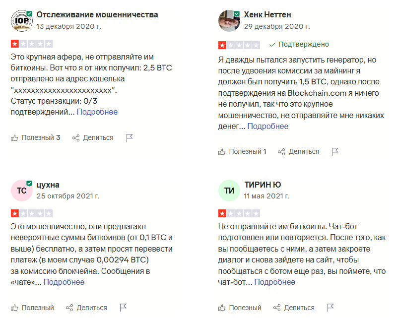На портале Trustpilot нет ни одного положительного комментария о работе проекта. Основная причина жалоб — требования оплатить комиссию сети. Также люди пишут, что не получали заработанных биткоинов после внесения средств.
