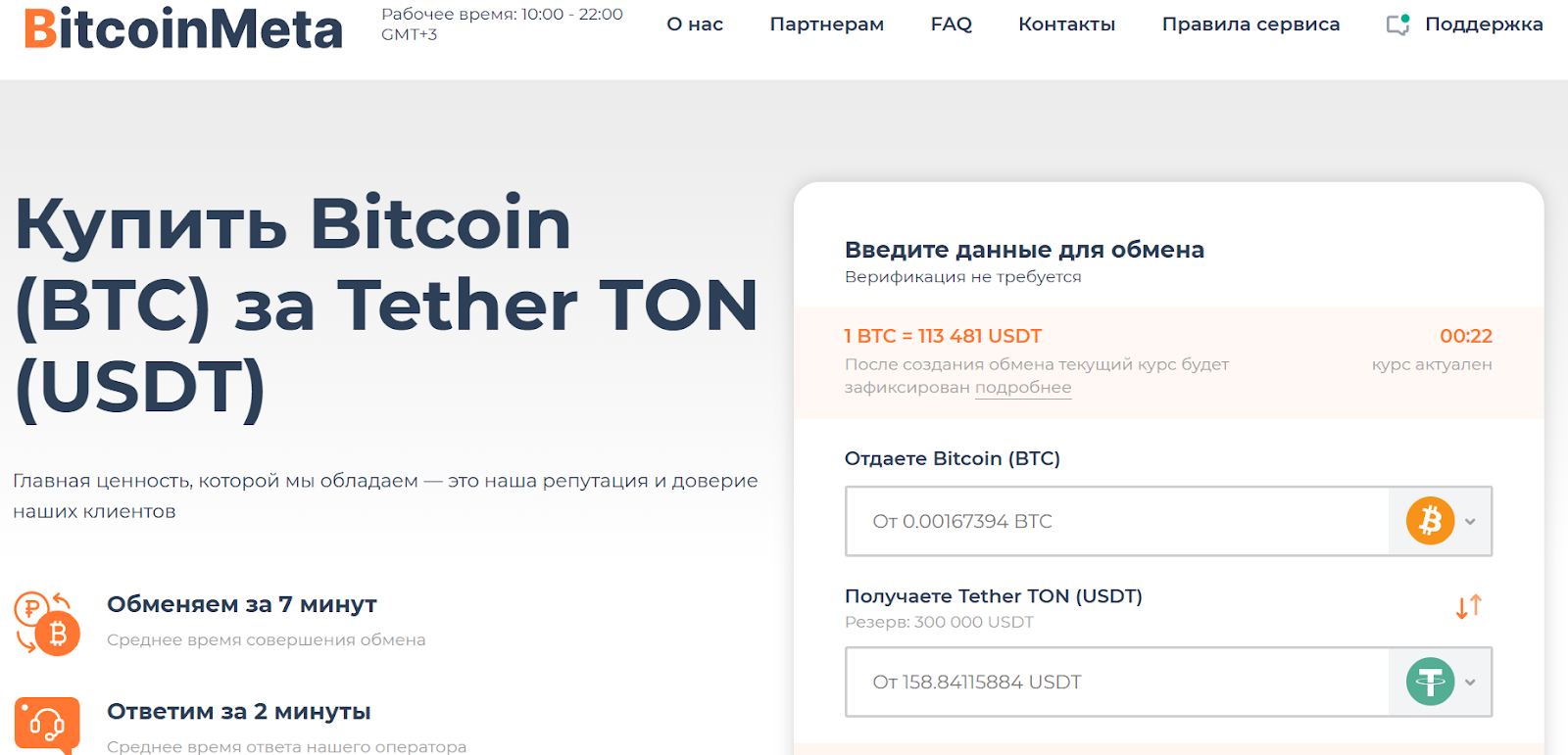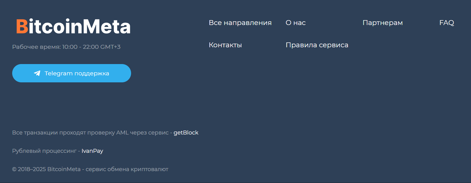 Обменник Bitcoin meta на главной странице заверяет, что здесь используется свыше 100 направлений для обмена. Также обещают оперативный ответ технической поддержки, который не должен занимать более 2 минут. При этом нужно учитывать, что есть рабочие часы, так как сервис доступен с 10 до 22 часов. Проверка показывает, что техподдержка Bitcoinmeta support в Телеграме, указанная на официальном сайте, удалена. Это уже вызывает сомнение в доверии к данному сервису.